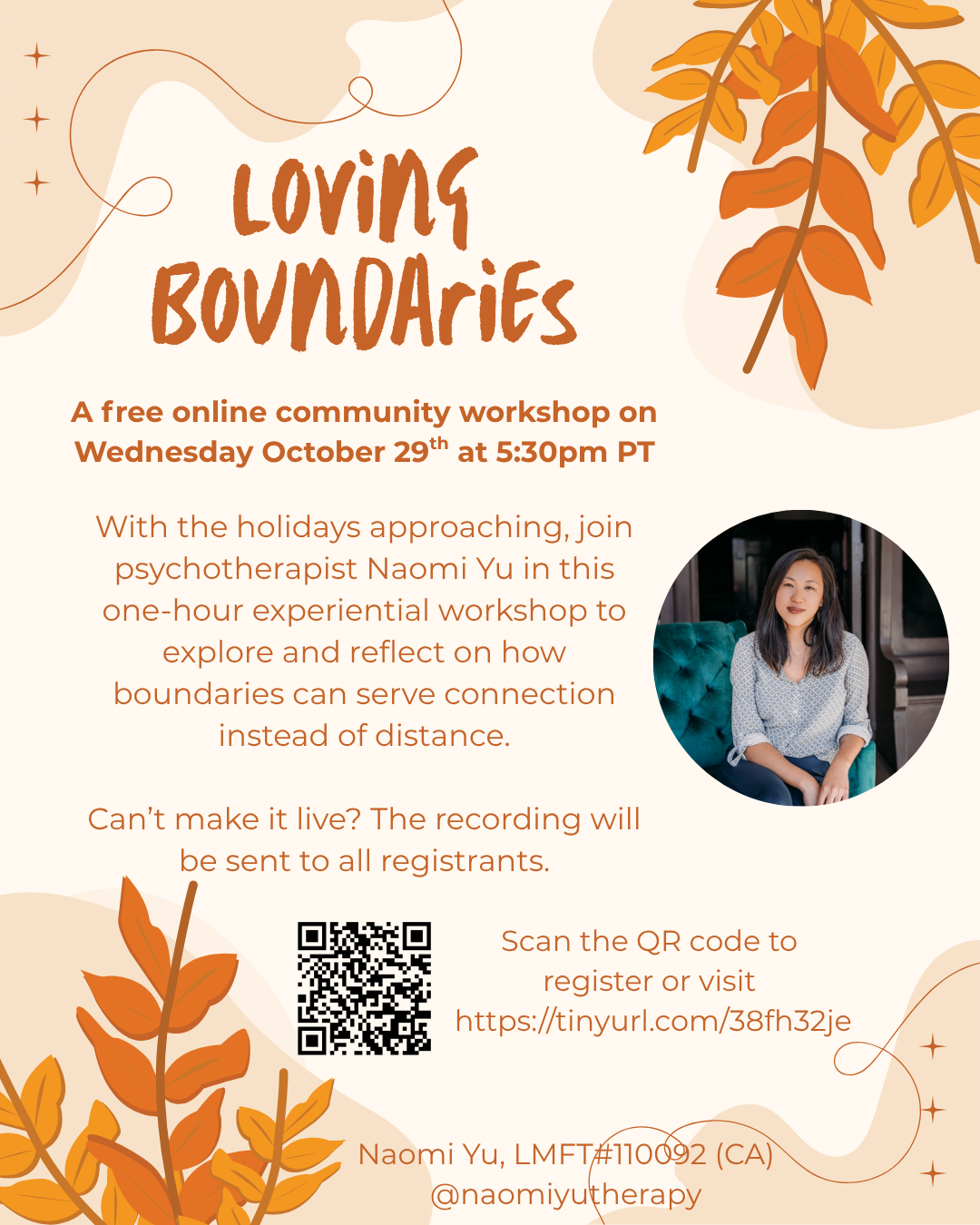 In addition, I am announcing a free online community workshop! Loving Boundaries will take place on Wednesday October 29th at 5:30pm PT. This one-hour workshop experiential workshop will help us explore and reflect on how boundaries can serve connection instead of distance. This workshop will be recorded and sent out to all registrants. Click here to learn more and register today!