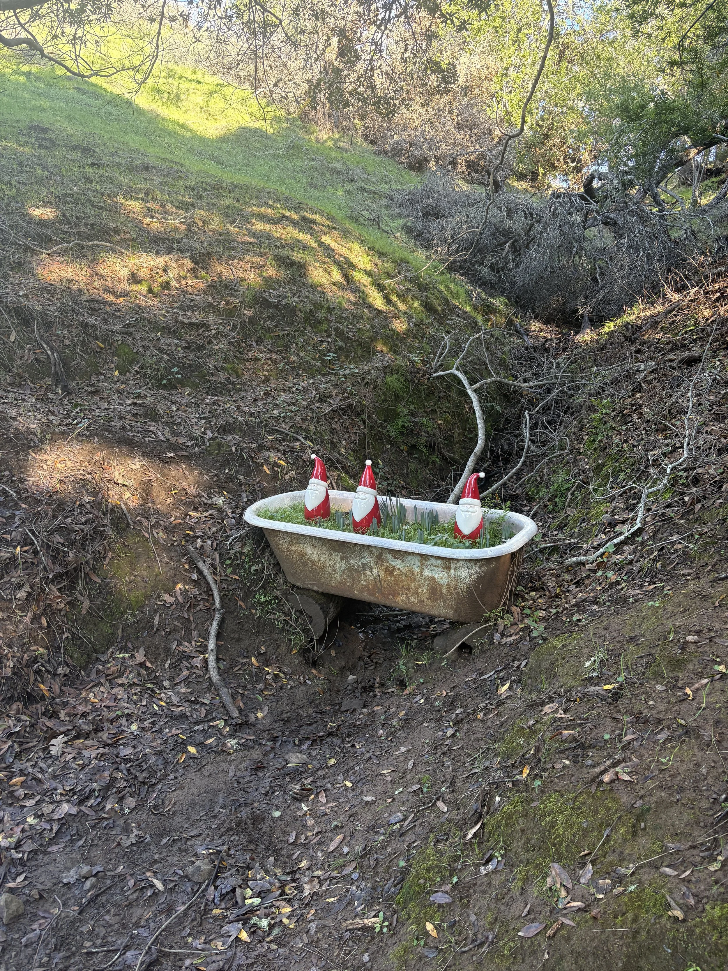 On a recent run in Marin I found a few silly unexpected things on the trails, like santas in a bathtub (see above).